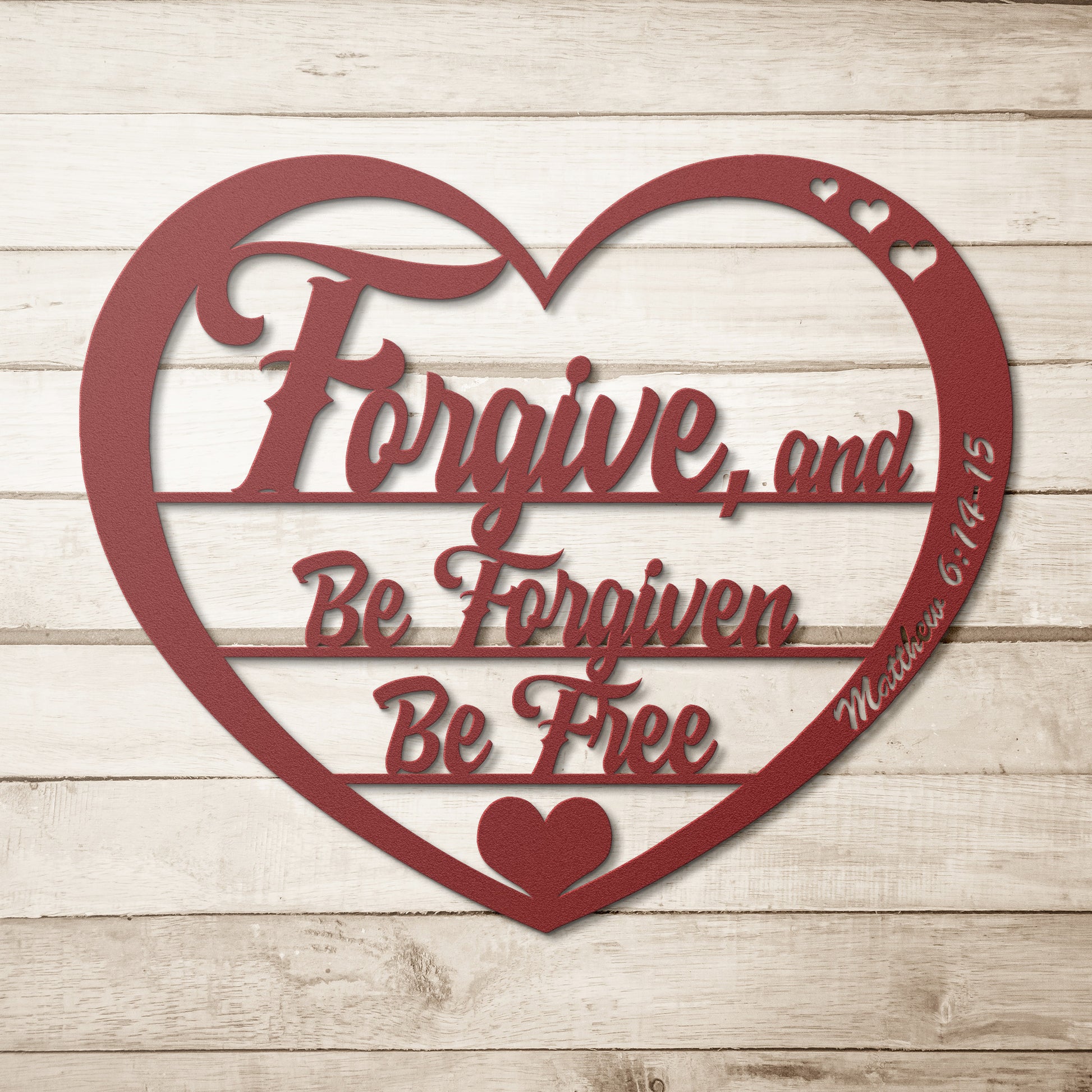 Forgiveness is such a major principal to ensure that we align ourselves with God’s word as we walk in freedom. Forgiveness is not easy, but it is freeing. As we journey through life, we have so many opportunities to practice the art of forgiveness, not only the forgiveness of others but the forgiveness of ourselves as well. Let this metal sign of forgiveness grace your home, or church on the inside, outside, or both.