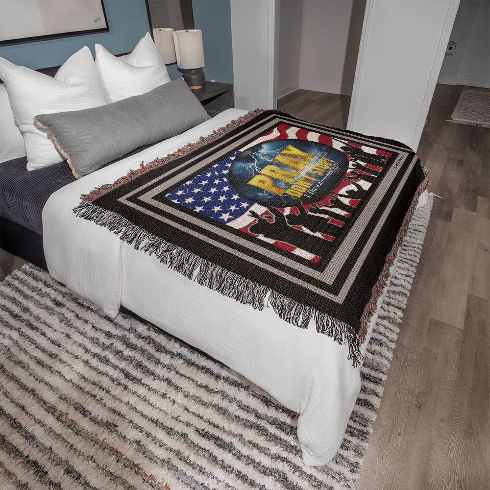 WOVEN TAPESTRY 80x60 - PRAY Don't Stop, Woven Tapestry Black, Grey Border